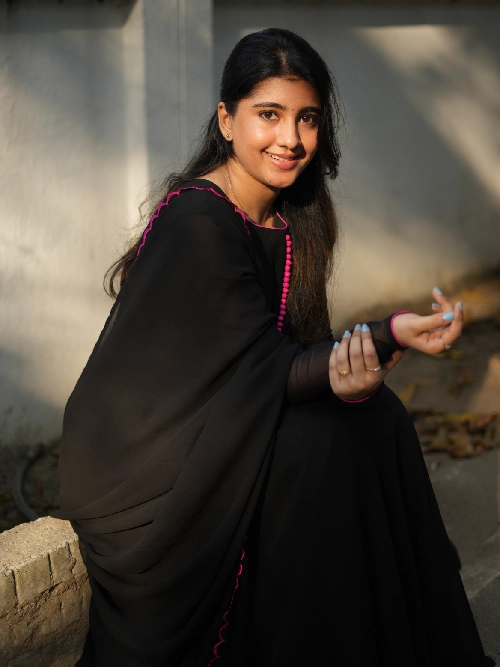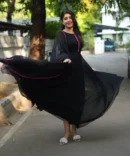 Black georgette Anarkali with potli balls for its elevated look complimented with scalloped dupatta