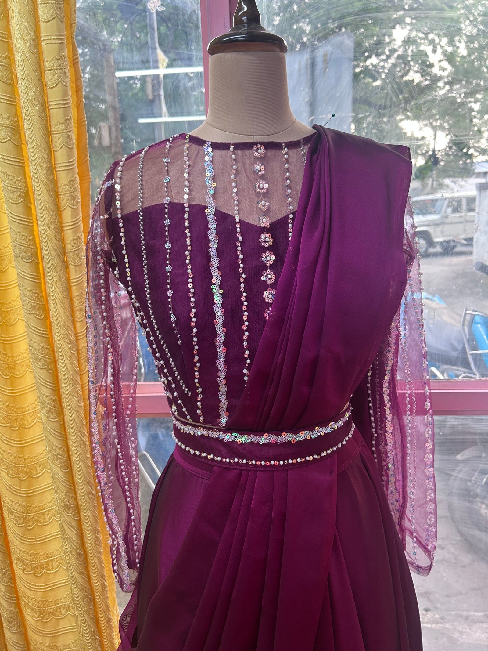 Step into elegance with this stunning wine-hued draped dress, crafted for a graceful silhouette. The glossy georgette skirt flows fluidly, adding a subtle sheen that catches the light beautifully, while the matching dupatta drapes effortlessly for a regal finish. Perfect for festive occasions, evening soirées, or weddings, this ensemble combines rich colour with refined design, exuding sophistication and charm at every turn.