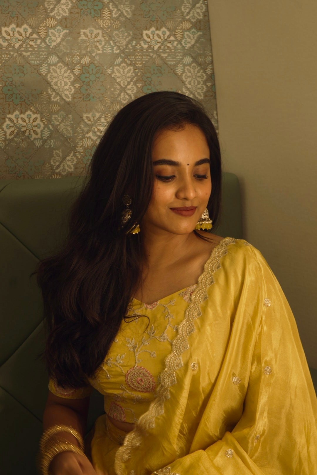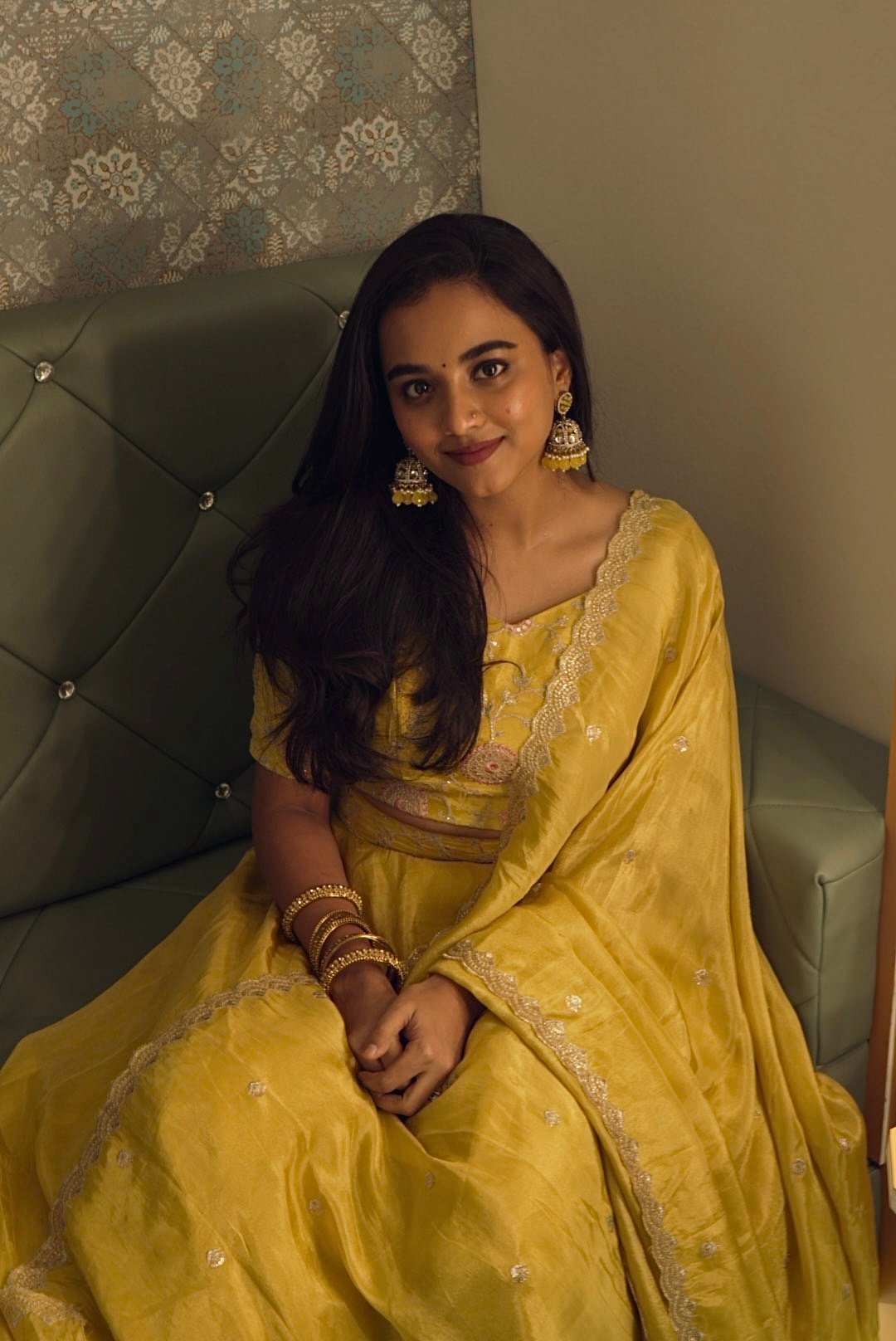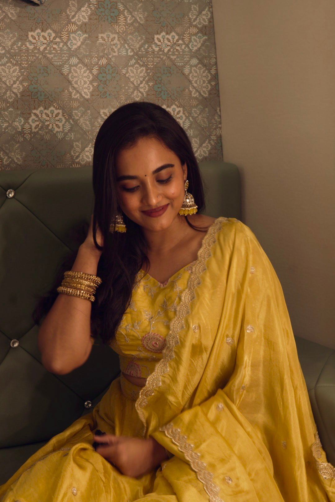 •Lehenga: A flowing yellow pure tissue silk skirt that enhances grace with its natural shimmer and structured fall.