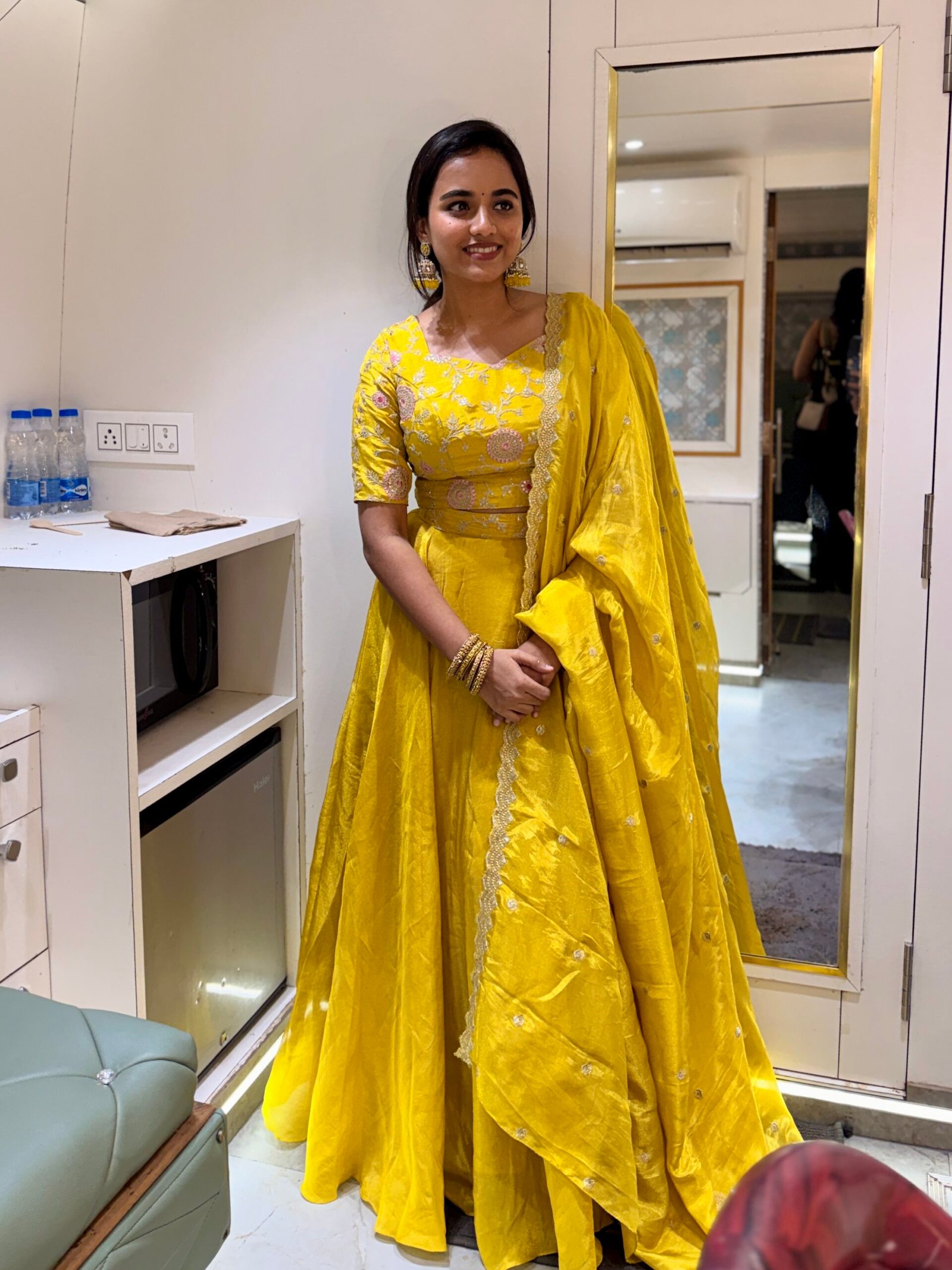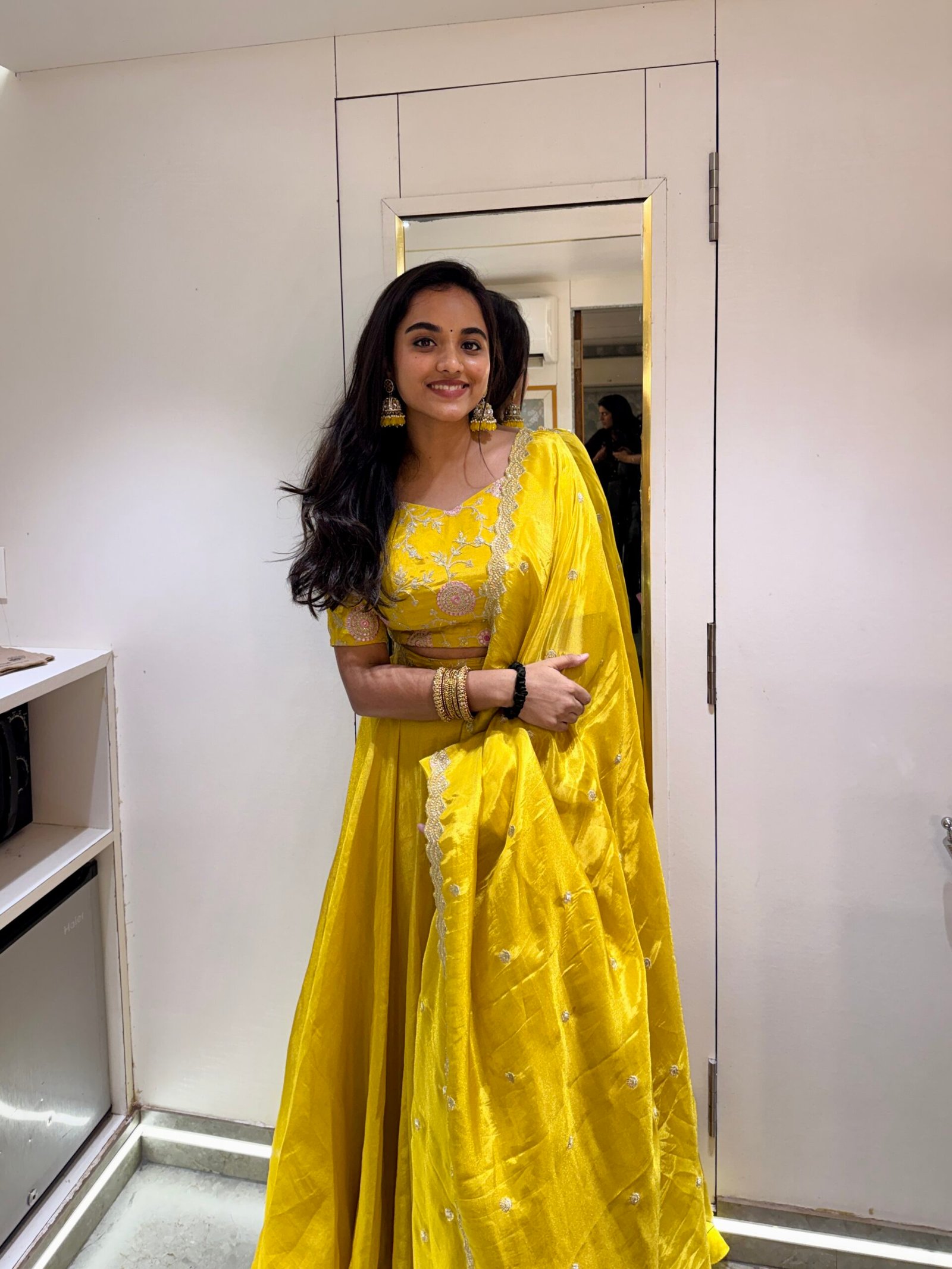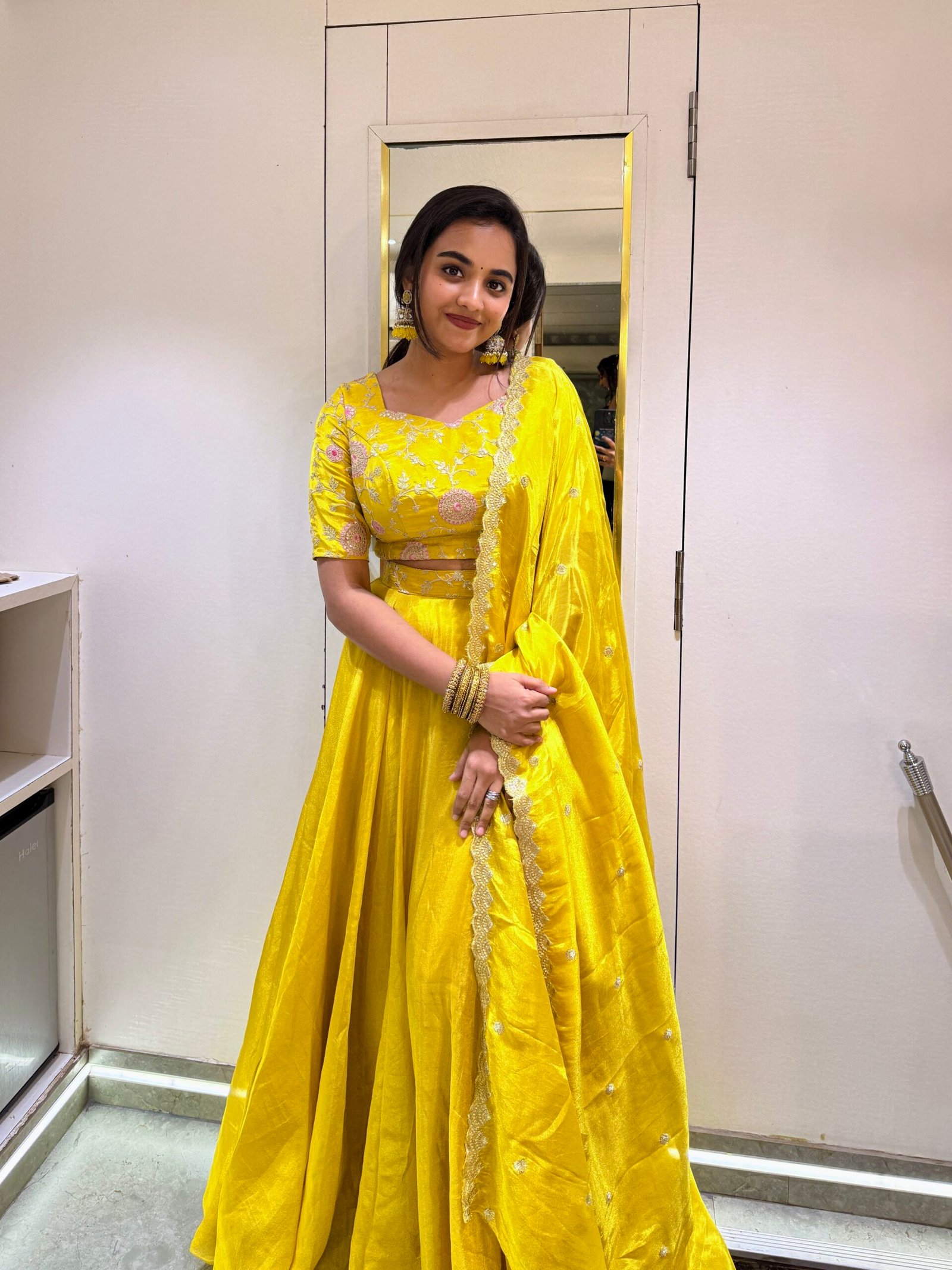 •Lehenga: A flowing yellow pure tissue silk skirt that enhances grace with its natural shimmer and structured fall.