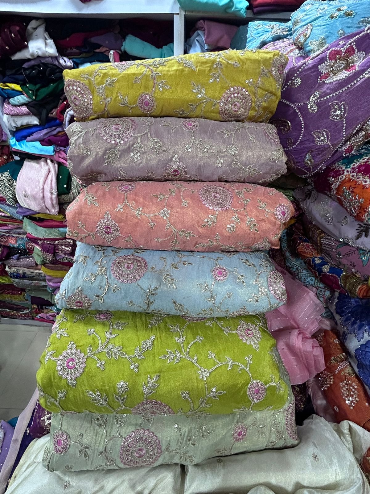 •Blouse: Intricately embroidered with delicate floral motifs in pastel pink and silver threads, featuring a flattering V-neckline and elbow-length sleeves.