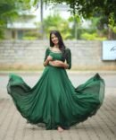 Grace meets elegance in our Riya 2 ensemble, a deep emerald green outfit designed to make a lasting impression. Crafted from premium georgette, the set includes a stylishly draped dupatta and a delicately embroidered blouse with intricate golden threadwork along the neckline, sleeves, and waistline.
