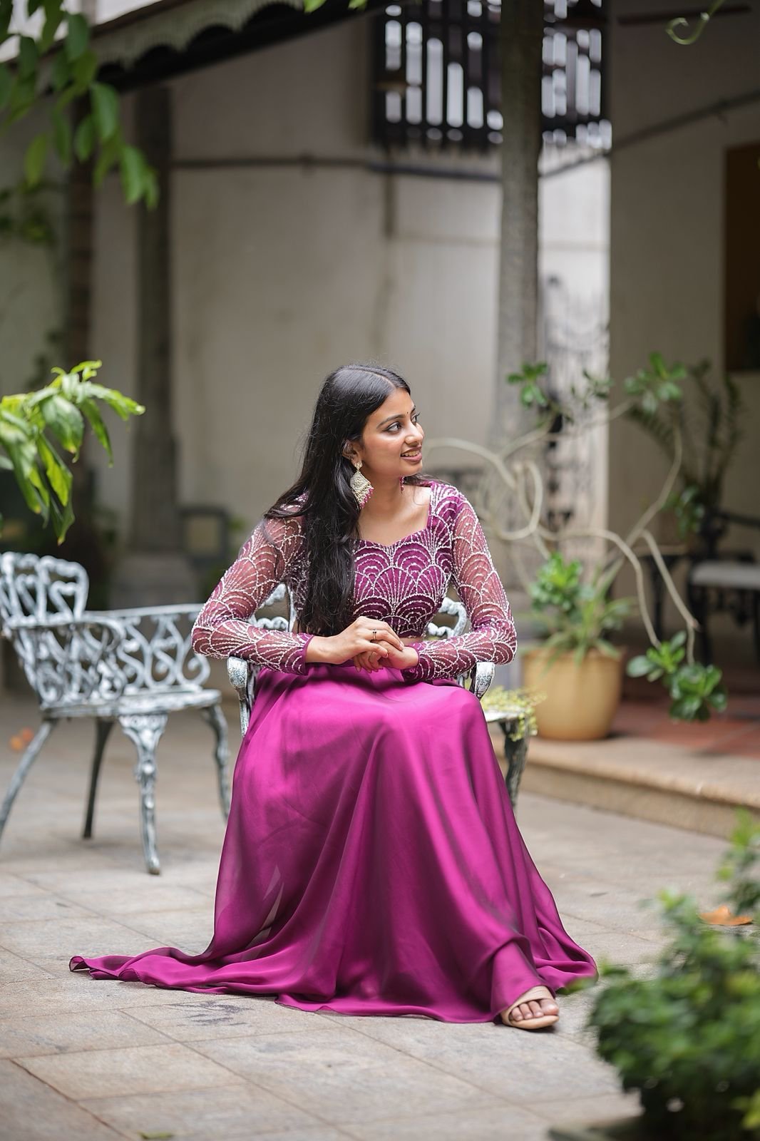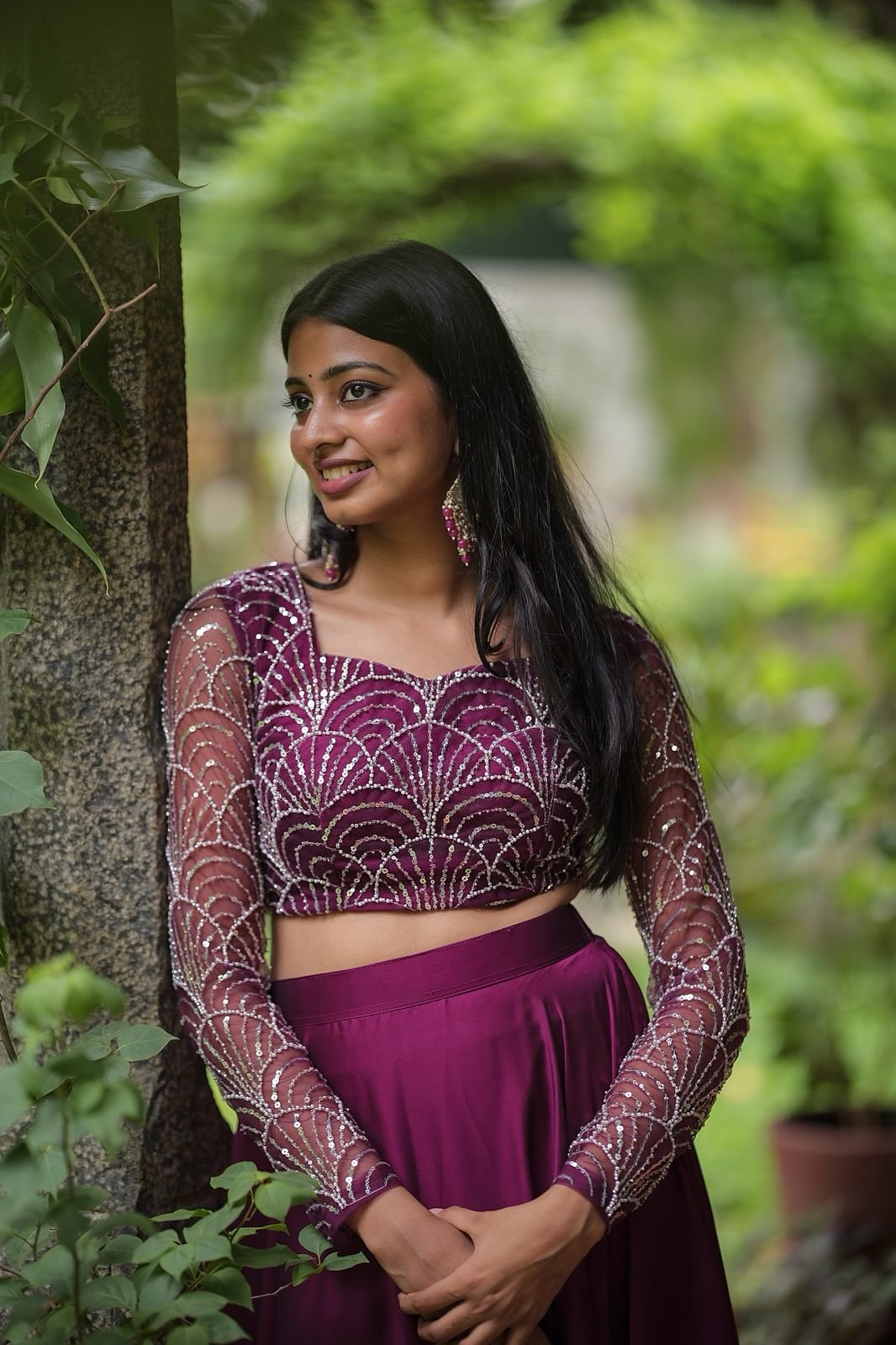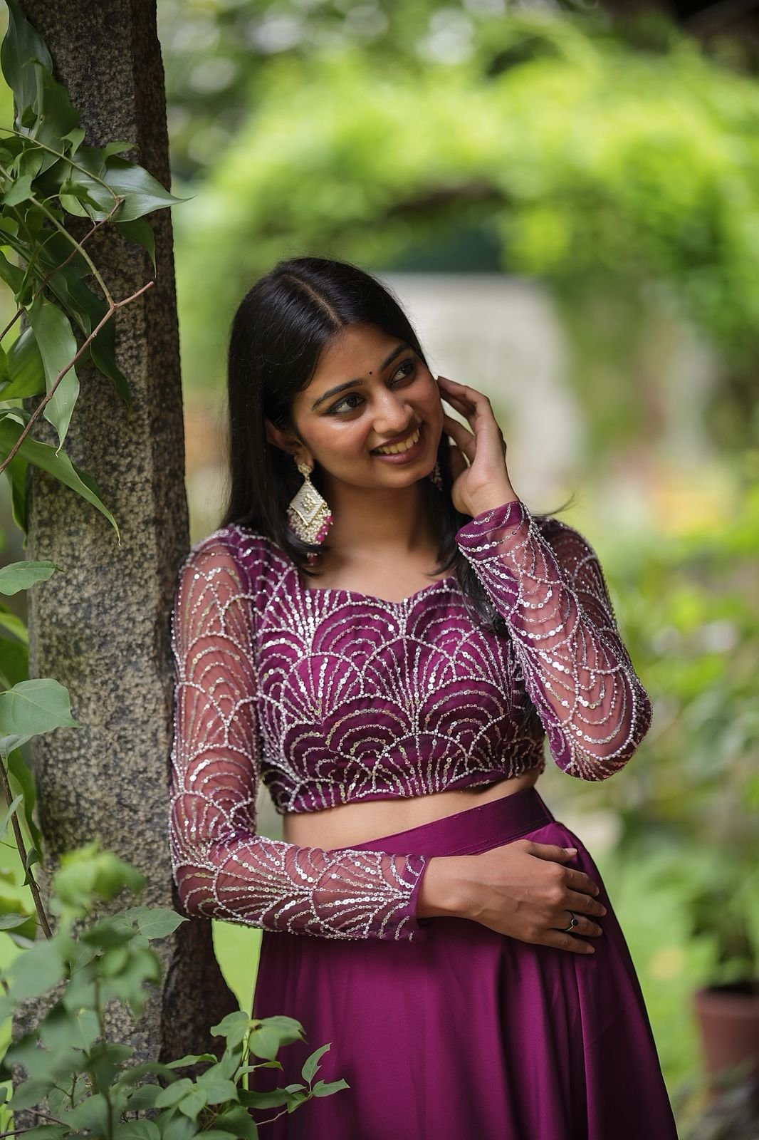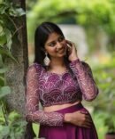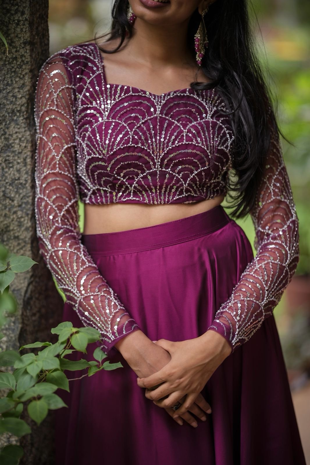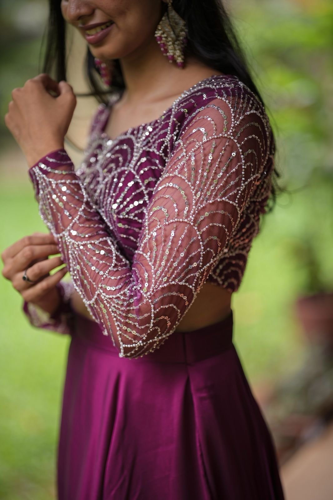 Wine Radiance is a stunning lehenga set crafted to make you shine at any celebration. The skirt and dupatta are made from luxurious glossy georgette, offering a graceful drape and elegant sheen. The blouse is tailored from fine net fabric, intricately embroidered with silver sequins in an art-deco-inspired scallop pattern. Sheer full sleeves add a modern, glamorous touch, while the rich wine-purple hue exudes regal charm. Perfect for weddings, receptions, and festive evenings.
